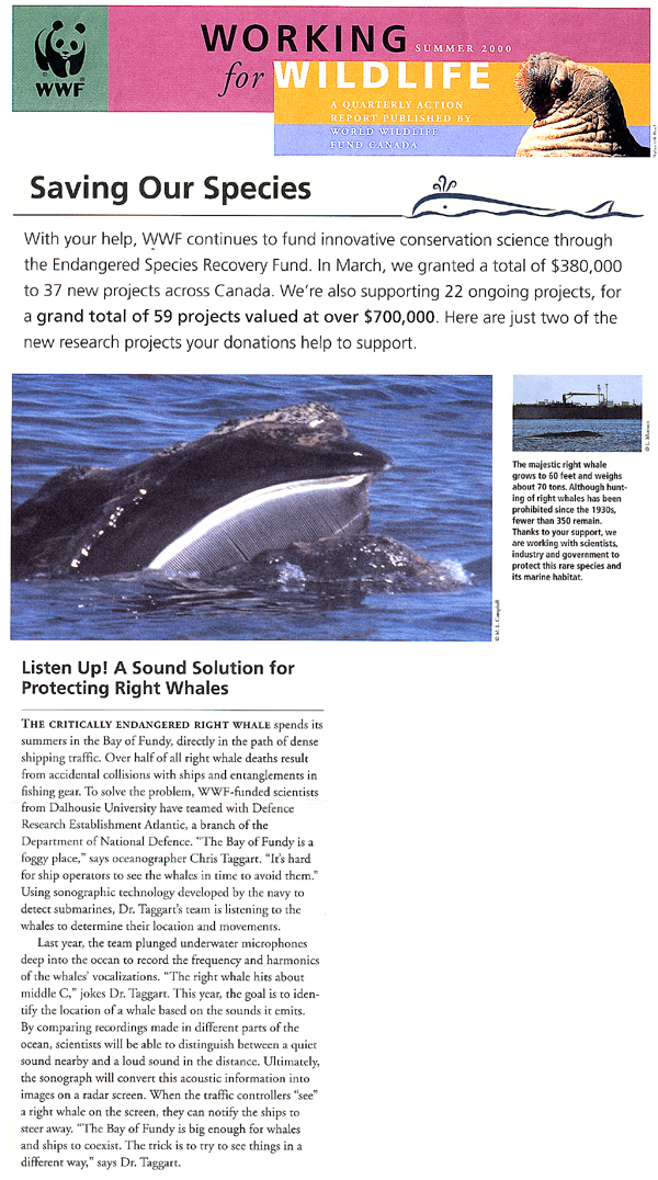 Listen Up! A Sound Solution for Protecting Right Whales. Working for Wildlife, Summer 2000. (Published by World Wildlife Fund Canada).