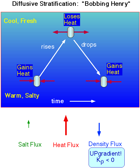 The same instability occurs with water parcels in such a stratification. The key to the instability is the fact that heat diffuses much more rapidly than salt (hence the term double-diffusion). The water parcel picks up heat, rises, loses heat, and falls, so transferring heat upwards just as the float does. Theoretical calculations for this situation (Turner, 1973) show that water parcels undergo a growing overstable buoyancy oscillation (see Internal waves 1), driven by heat diffusion.