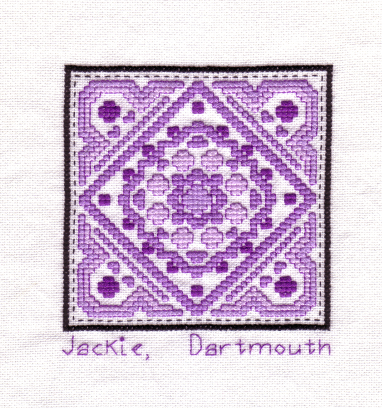 This spring a group of cross stitchers decided to make a quilt for another cross stitching friend, Gail Gouchie, who was diagnosed with Creutzfeldt Jakob Disease. There were 25 squares in all. The above is my small contribution. The patterns for all of the squares were designed and generously donated to us by Catia Dias. Sadly, Gail passed away in October, 2012.