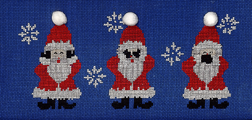 Hear No Evil, See no Evil, Speak no Evil. I think I found this in an old issue of McCalls Needlework. I'll cite it when I find it. The pompoms are real pompoms.