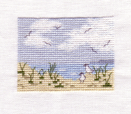 Stitched this miniature beach scene for me, probably. It's only 44 x 35 stitches.